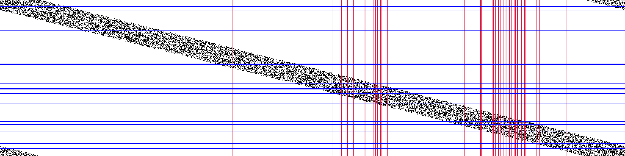 Focus on the black diagonal. Wherever there are lots of blue lines crossing the black, there are lots of red lines. Everywhere else, nothing.